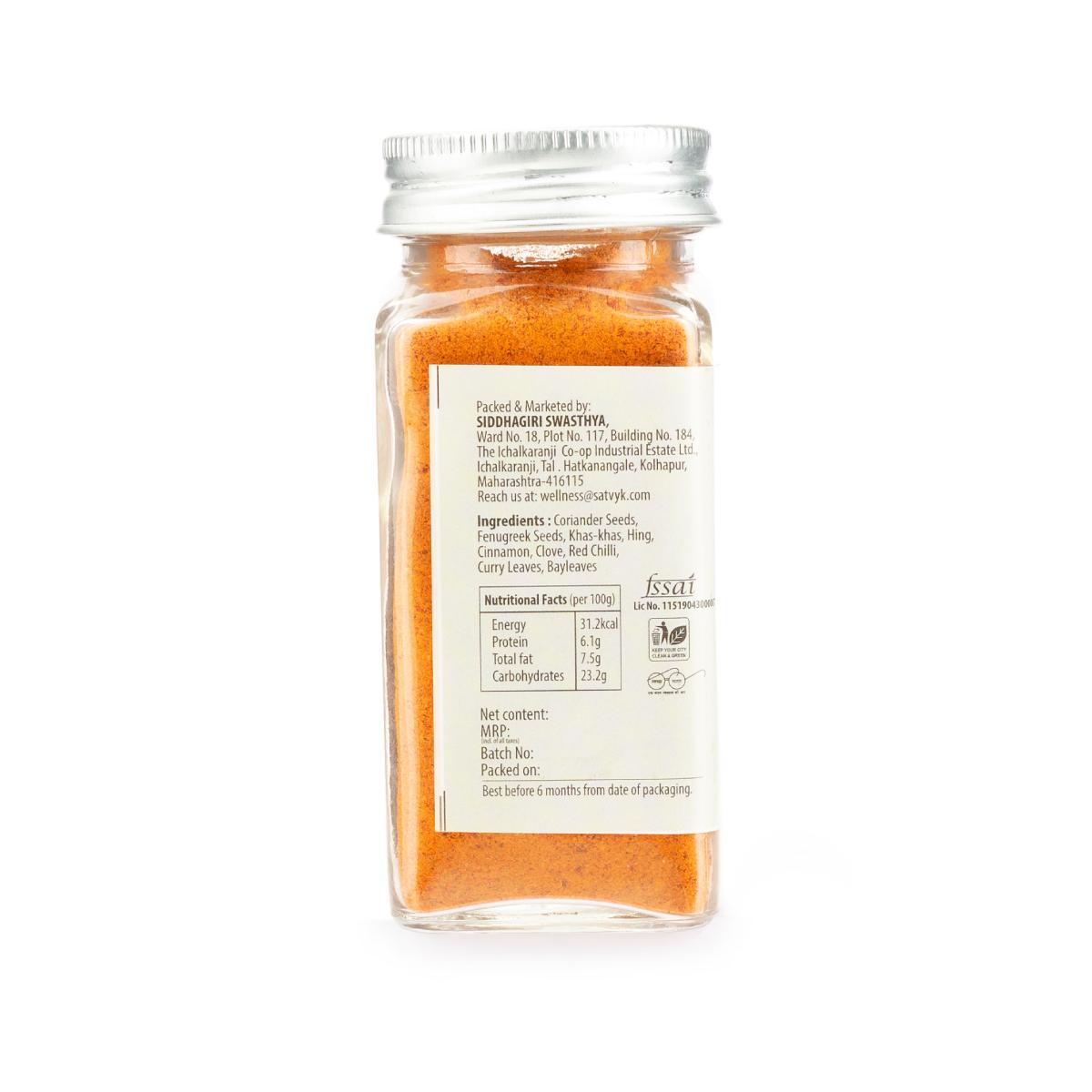 Coriander, Fenugreek, Khaskhas, Cumin, Cumin, Hing, Cinnamon Bark, Clove, Red Chilli Powder, Curry Leaves and Bayleaf.
